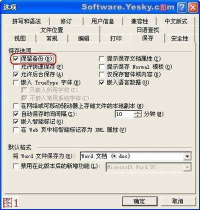 启动Word2003(其它版本操作相似,下同),执行“工具→选项”命令,打开“选项”对话框(如图1),切换到“保存”标签下,选中“保留备份”选项,确定返回。