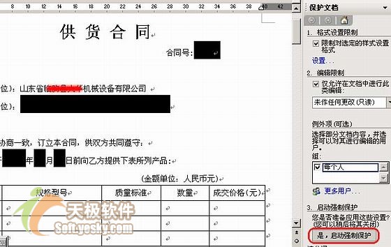 利用Word 2003的“保护文档”,我们可以设置文档中的部分指定内容为可修改。 一日朋友给我打电话说:由于公司常常跟客户签供货合同,所以把供货合同做成了Word模板,打印合同时只需更改部分固定的内容即可,但在填写合同时,常常会把合同中不需更改的内容调乱。他问我有没有只更改文档中的指定位置内容,其它位置不答应修改的办法。其实利用Word 2003中的“文档保护”就可以实现这一功能。 我们来看一下详细的操作: 1. 从“工具”菜单选择“保护文档”,在窗口的右侧显示相关设置,如图1所示。 2. 选中“仅答应在文档中进行此类编辑”,选择默认选项“未作任何更改”,这样任何人打开文档都是只读状态,不能修改文档内容。 3. 在文档中选中所有答应修改的部分,可以按住Ctrl键连续选项取多个区域。 4. 在任务窗格中选中“例外项”下的“每个人”,最后,单击“是,启动强制保护”按钮,如图2所示。设置密码后,单击“确定”。 这样,任何人打开文档时,都只能在上述指定位置输入或修改内容,而对未选择的内容则不能做任何修改。 提示:在设置前最好把状态栏中的“插入/改写”选在“改写”状态,这样我们输入内容时就不会出现空格部分向后推移的情况发生,而直接把空格部分改为所填内容。 返回类别: 教程 上一教程: 去掉Office中讨厌的“文字服务” 下一教程: 搜到自家屋顶 军事专家称Google地图泄密 您可以阅读与"巧用Word“保护文档”限制文档修改范围"相关的教程: · 用“保护文档”功能规范和保护Word文档样式 · 巧用Word“查找替换”迅速整理扫描文档 · Word2003中保护局部文档内容 · 简朴三步 解除Word文档保护密码 · 另类妙招助你“加密”Word文档 |