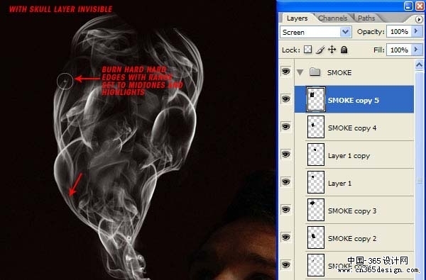 | 9、继承烟雾的操作,在骷髅边缘需要加深的地方,刚用加深工具对其加深变亮。使骷髅更有层次感。不要怕做坏,我们可以在历吏面板上退回到前面几步,直到没有错误。再复制烟雾图层,做出效果如图所示: |
