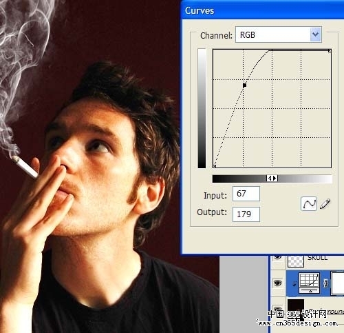 | 17、选择"吸烟者"图层,在面板上选择:新建调整图层>曲线。设置如图。选择画笔,修改一下眼睛,和皮肤上的一些小问题。 |