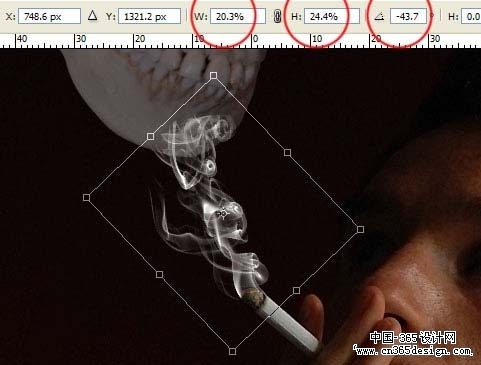 | 8、按CTRL+T,选中刚拖进来的那个图层,右击在菜单中选择自同变换。利用手柄和操作点,让烟看起来像绕在骷髅的边缘。然后再利用涂抹工具(设置70%左右)来涂抹那些生硬的地方。
