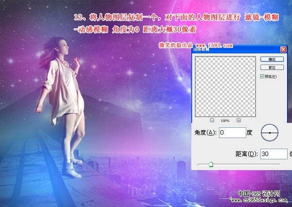 > 模糊 > 动感模糊,参数设置如下图。 |