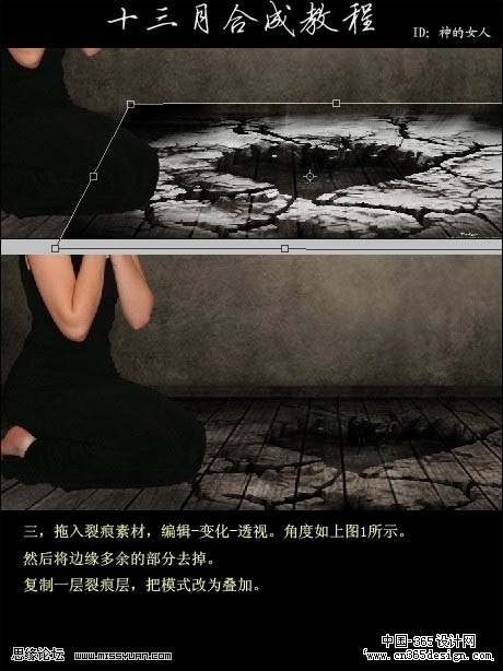 > 变化 > 透视。角度如下图所示。然后将边缘多余的部分去掉,复制一层图层混合模式改为“叠加”。 |