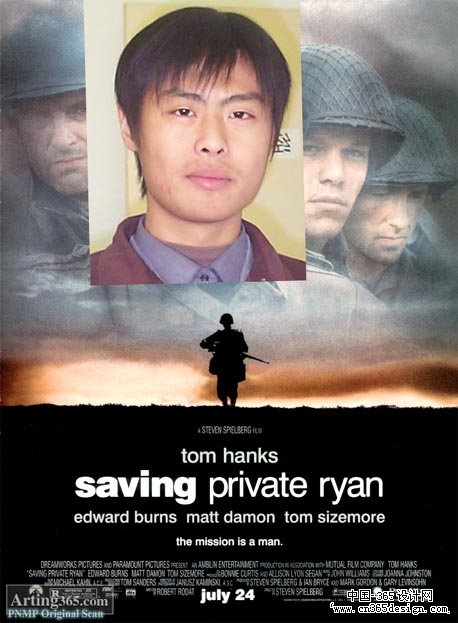 | 1、先研究一下底图人物--米勒中尉--的面部。此人五官距离比较近,而我们的理想却是帅哥,因此,常用的参考线对瞳的办法在这里用不上,必须参考唇缝的位置,做一个适当的折中。心中有数以后,把理想的头像贴上去,这个时候当然还很不像样。 |