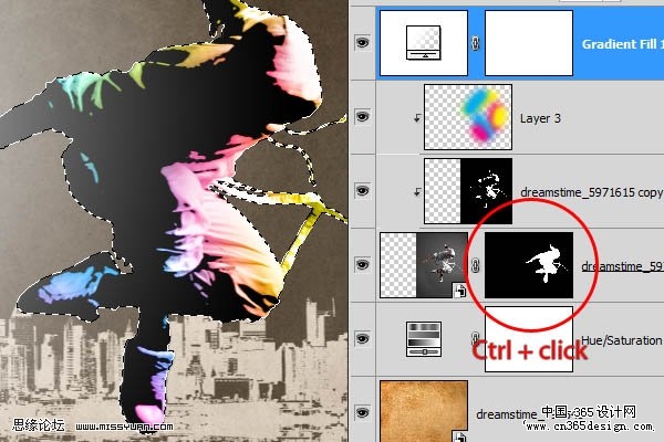 | 40、提取人物:按住Ctrl键,点击人物蒙板图标(如图所示),你见看到人物四面出现蚂蚁线。 |