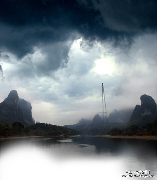 | 12、在打开“素材6”将其拖拽至画布,并将其拖到“山”组的下方,得到如图19所示效果。设置图层5的混合模式为“变暗”,在给其谈价“图层蒙版”用画笔工具涂抹得到如图20所示效果。 |