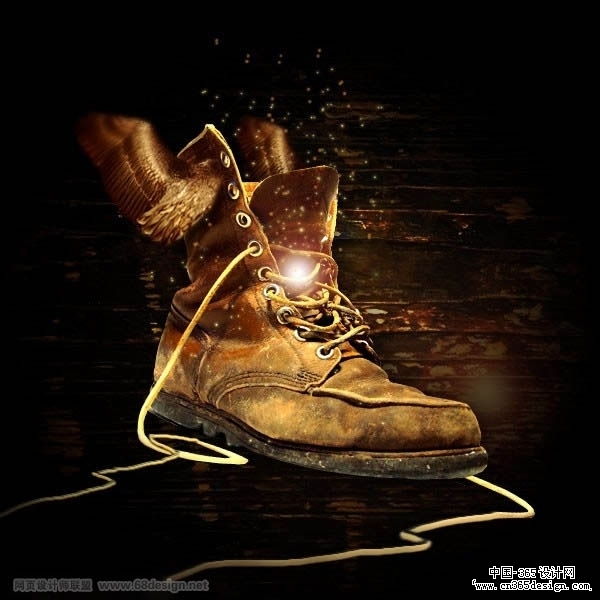| 26、选择皮靴图层,用低流量的大号柔角笔刷刷饰鞋带,使鞋带渐隐在背景里。 |
