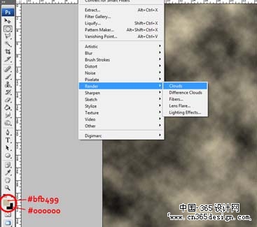 | 17、添加雾创建新图层,用黑色填充。然后去滤镜》渲染》云层。运用这些色彩代码:#bfb499和#000000。