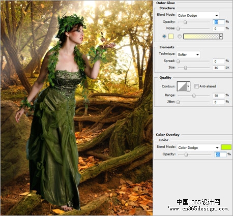 | 4、把美女图片放到森林背景上面,设置外发光样式,图层模式设置为颜色减淡,透明度为22%,颜色为#FFFFBE,大小为46px效果如下: |